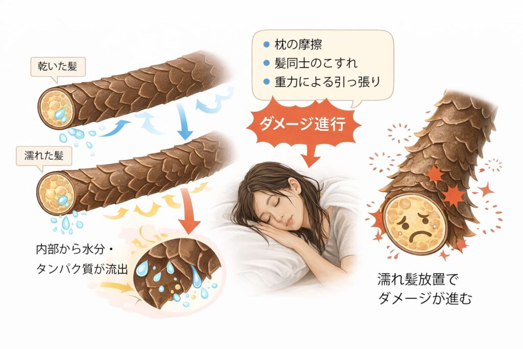 今回は美容師の視点から、濡れた髪を放置すると起こることをわかりやすくお伝えします。