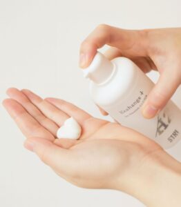 ヘアミルクやヘアオイルを少量手に取り、手のひらでしっかりとなじませます。