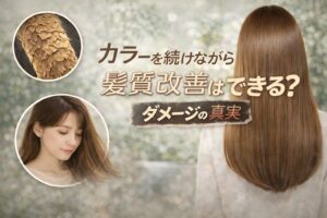 「カラーはやめたくない。でも髪はキレイにしたい。」 30〜40代のお客様から、特に多いご相談です。 結論からお伝えすると―― カラーを続けながらでも髪質改善は可能です。 ただし、“やり方”を間違えなければ、です。 👉 内 […]